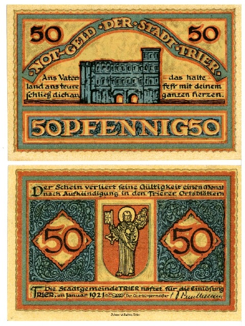 Inflation, Arbeitslosigkeit und die Weltwirtschaftskrise machten in den 1920er Jahren auch vor Trier nicht halt. Im Jahr 1918 wurden hier erste Notgeldmünzen herausgegeben, die bald von Kleingeldscheinen abgelöst wurden. Mit einem gewissen Stolz auf ihr römisches Erbe wählte die Stadt mitunter bedeutende Baudenkmäler als Motiv, um diese Geldscheine ansprechend zu gestalten. Künstler wurden gebeten, eigene Entwürfe einzureichen, daneben griff man auch auf bereits vorhandene Gemälde oder Grafiken als Vorlage zurück. Das schnell an Wert verlierende Notgeld sollte zumindest optisch attraktiv bleiben!