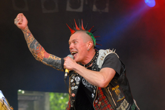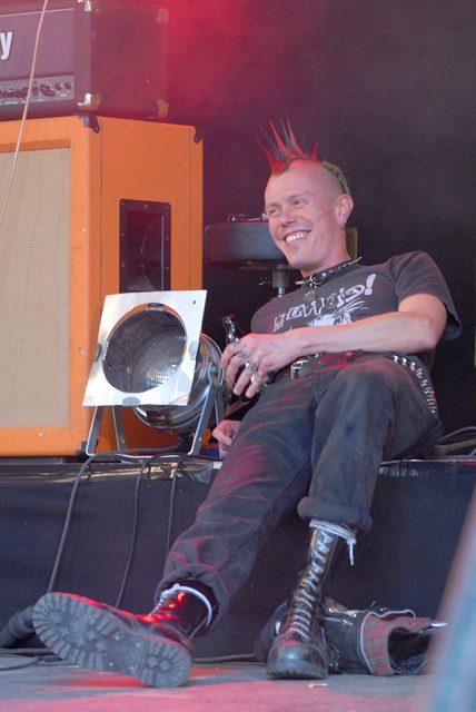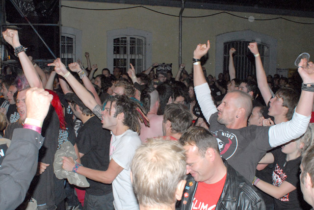 Dadurch entgeht ihm, wie auch den etwa ein Hundert am Parkplatzmäuerchen verweilenden Fans, der Auftritt von Bildungslücke – der amüsanteste Auftritt des Abends. Dass der Sänger ab und zu auf Textblätter schauen muss, liegt daran, dass er nicht der Stammsänger der Band ist. Gizmo von Frontex ist für seinen Kumpel eingesprungen, der eine Reisebuchung nicht mehr rückgängig machen konnte. Und obwohl Gizmos Stimme noch von einem Konzert am Vorabend angeschlagen ist, gibt er alles. Der freundliche Mann mit dem schönsten Iro des Festivals keift die superschnellen Hardcore-Punk-Stücke wie „Europa rüstet auf“ („Fast unsingable“, Gizmo), „MTV-VIVA-Punx“ oder „Dosenbier“ und zieht dabei Grimassen, dass es eine Art hat.
