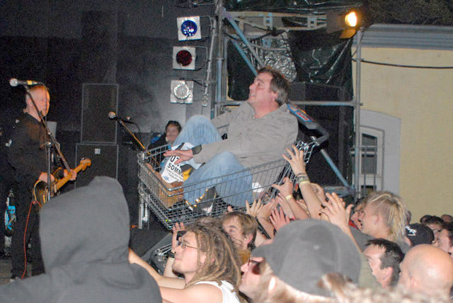 Wie wohl diese Menschen reagiert hätten, wenn sie des Konzertes von Slime ansichtig geworden wären? Es wird gepogt, dass die Schwarte kracht, beim Stagediven geht so mancher Sprung ins Leere und im Laufe des Auftritts wird ein Zuschauer in einem Einkaufswagen über die Köpfe des Publikums hinweggetragen, was selbst die an extremen Erfahrungen nicht arme Band staunen lässt.