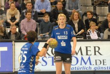 Nach einer halben Stunde sah es nicht so aus, als gäbe es nach dem Spiel für die Miezen etwas zu feiern. 15 Minuten waren sie mit den Aufsteigerinnen aus Metzingen auf Augenhöhe. Die Gäste gingen zwar in Führung, konnten sich aber bis zur 23. Minute nie mehr als zwei Tore absetzen. Als beim Stande von 10:11 in der 19. Minute die verletzte Miroslava Jelicic für einen Siebenmeter eingewechselt wurde, diesen aber vergab, war bei den Miezen der Wurm drin. Anne Bocka konnte zwar durch drei Glanzparaden hintereinander den Abstand zwischen beiden Mannschaften noch ein paar Minuten klein halten, doch weil Triers Top-Scorerin Carolin Schmele in den letzten zehn Minuten der ersten Halbzeit kein vernünftiger Wurf mehr gelang, sich die Abspielfehler häuften und die Schwäbinnen spritziger und effektiver spielten, lagen die Gastgeberinnen nach 30 Minuten mit 11:18 hinten. Vor allem die quirlige Ina Großmann auf der linken Seite und Annamària Ilyès bekamen die Miezen nicht in den Griff – beiden trafen in der ersten Hälfte jeweils fünf Mal.