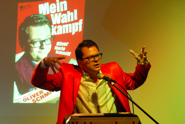 Die Menge tobte, als Oliver Maria Schmitt ans Stehpult schritt, um seine Abschlussrede, die „Große Trierer Rede„, zu halten. Zuvor hatte der Satiriker und Hobby-Politiker an einem schlecht beleuchteten Tisch seine niedergeschriebenen Erlebnisse und Erfahrungen aus dem Frankfurter OB-Wahlkampf („Mein Wahlkampf“) im vergangenen Jahr geschildert. Gestärkt durch eine halbe Flasche Riesling Spätlese und durch den Beifall der knapp 100 Besucher legte der versierte Rhetoriker im roten Plastikanzug los. 15 Minuten lang parodierte er Politikerphrasen und verarbeitete die berühmtesten und berüchtigsten Reden von Obama über Martin Luther King bis Goebbels in seinem Vortrag. „Hinweg mit das Merkel, nieder mit Steinbrück! Und deshalb: Macht alle mit, wählt Oliver Maria Schmitt!“, polterte Schmitt zum Finale, das in der unbegründeten Forderung gipfelte: „Im Übrigen bin ich der Meinung, dass Schweich zerstört werden muss.“