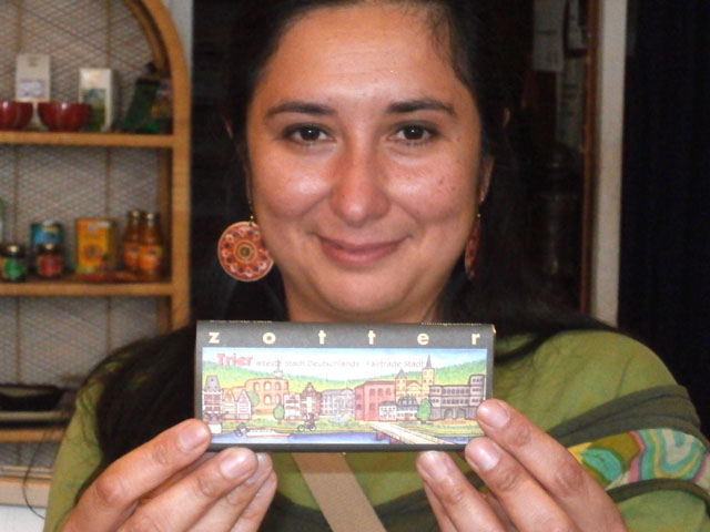Die handgeschöpfte Schokolade wird umweltfreundlich verpackt und auch die Farben der bedruckten Banderolen sind frei von Schadstoffen. Für das Motiv der Trier-Schokolade zeichnet Carolina Fuentes verantwortlich. Die chilenische Grafikerin und Künstlerin, die seit elf Jahren in Trier lebt und im Weltladen mitarbeitet, entwarf die Verpackung, die die bekanntesten Sehenswürdigkeiten der Stadt zeigt.