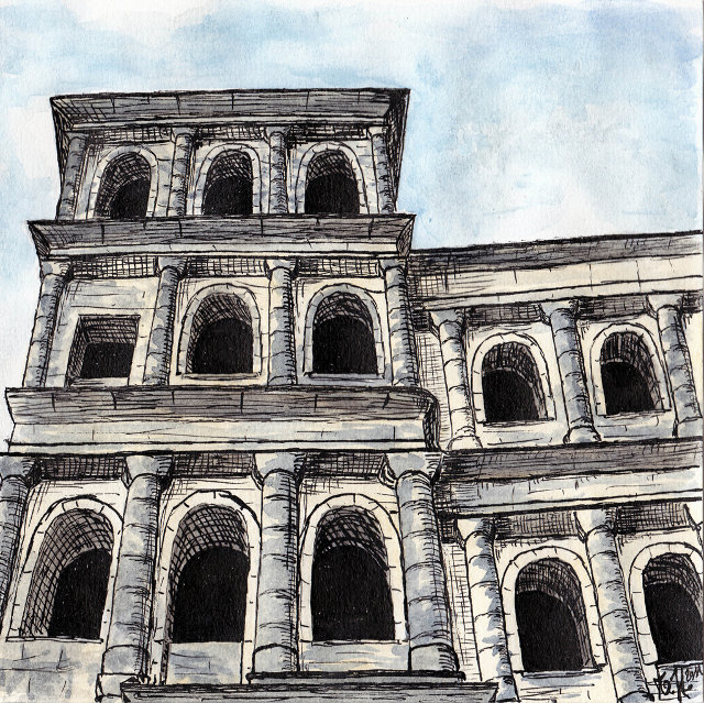 Die Studentin malte Gesamtansichten und Details von Triers Wahrzeichen und der Igeler Säule – manche mit Menschen, manche ohne. In den kurzen Kommentaren dazu auf der Internetseite wird bereits ihre Begeisterung für die Motive deutlich. „Die Bauwerke sind keinesfalls nur Vergangenheit, sondern sie sind hochgradig gegenwärtig. Mich haben sie total begeistert und diese Begeisterung möchte ich gerne teilen.“