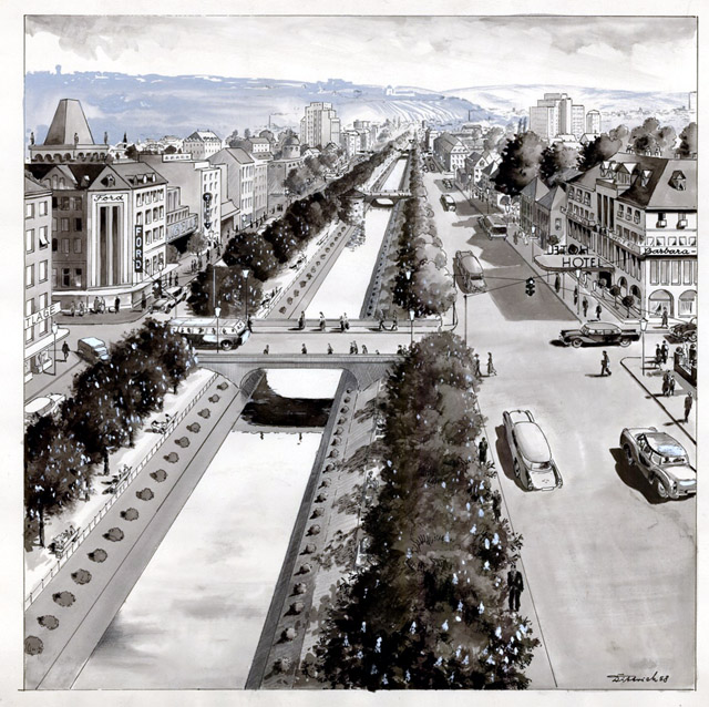 Das gilt erst recht für die Tuschezeichnungen, die aus der Feder des früh verstorbenen und weitgehend in Vergessenheit geratenen Malers und Grafikers Martin Dittrich stammen. 1928 in Berlin geboren, starb Dietrich 1958 in Trier. Kurz vor seinem Tod entstanden seine futuristisch anmutenden Werke, die ein utopisches Bild von Trier zeichnen. Ob er damit einen eher ironisierenden Blick auf die Zukunft der Moselstadt werfen wollte oder die Zeichnungen zumindest teilweise Dietrichs tatsächliche Erwartungen an die weitere Entwicklung des Stadtbild wiedergeben, lässt sich heute nicht mehr klären. Fakt ist, dass sich gerade in den 1950er und 60er- Jahren an der Frage, wie Deutschlands Städte wieder errichtet werden sollten, die Geister schieden. Manche behaupten, das Stadtbild Triers haben weniger unter seiner rund 40-prozentigen Zerstörung im Zweiten Weltkrieg denn durch den Modernisierungswahn zeitgenössischer Architekten, Stadtplaner und Politiker gelitten. Für diese These lassen sich einige Beispiele anführen, beispielsweise die schon erwähnte „Treveris“ und das alte Hotel „Porta Nigra“, aber auch die Martinsmühle an der Kaiser-Wilhelm-Brücke, die nach dem Krieg dem Ausbau des Brückenkopfs und der Moseluferstraße zum Opfer fiel.