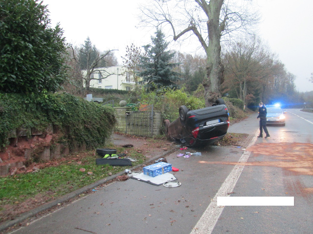 Gegen 8.10 Uhr kam der aus Richtung Stadtmitte kommende Kleinwagen aus bislang ungeklärten Gründen im Anschluss einer Linkskurve nach links von der Fahrbahn ab. Dort prallte er zunächst gegen eine Pflanzkübelmauer, überschlug sich und kam auf dem Dach liegend an einem Baum zum Stillstand.