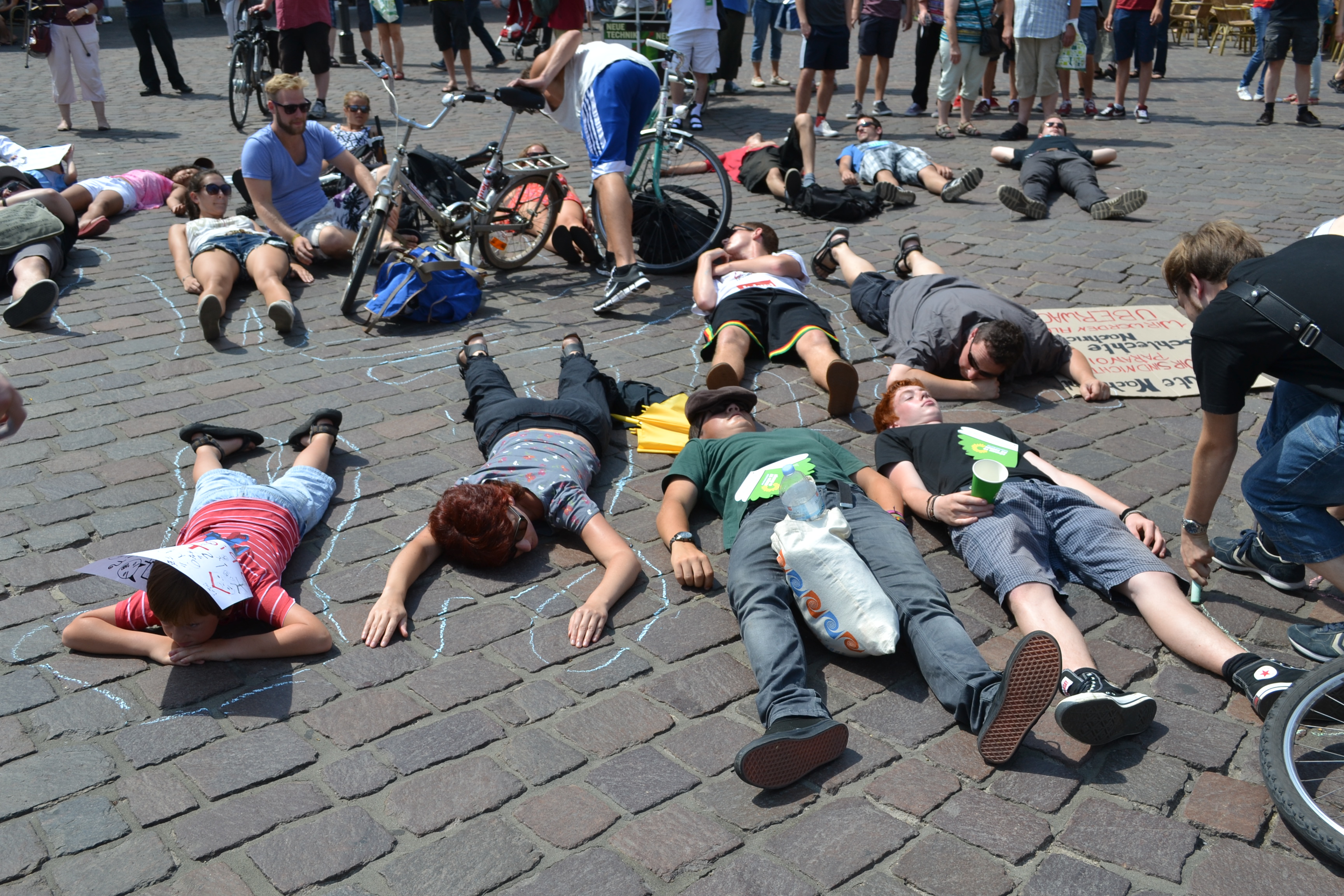 Auf dem Hauptmarkt legten sich die Teilnehmer des Demonstrationszugs zu Sirenengeheul aufs Pflaster des Platzes. Aktivisten zeichneten ihre Körperumrisse mit Kreide ab – als symbolisches Zeichen für die Überwachung eines jeden einzelnen. Die Veranstaltung klang vor der Porta Nigra aus.