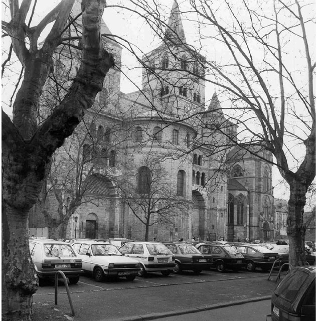 Der Domfreihof und vor allem der Platanen-Streit füllen in Schröers Buch viele Seiten, doch steigt der Autor früher ein. 1971 beschloss der Stadtrat die probeweise Einführung einer Fußgängerzone – auf eigene Initiative und ohne dass der Stadtvorstand eine entsprechende Vorlage geliefert hätte. Eine für damalige Verhältnisse mutige Entscheidung, passierten doch stündlich noch bis zu 3.000 Fahrzeuge die Simeonstraße. In der Bevölkerung schien eine Mehrheit für die Fußgängerzone vorhanden, doch waren wichtige Fragen nicht geklärt; etwa die, wie der gesamte Verkehr umgeleitet werden sollte. Der ewigen Diskussionen leid, beschloss der Rat die Fußgängerzone, und so wurde binnen weniger Monate bis auf die Stadtbusse der gesamte motorisierte Verkehr aus den betroffenen Straßen verbannt.